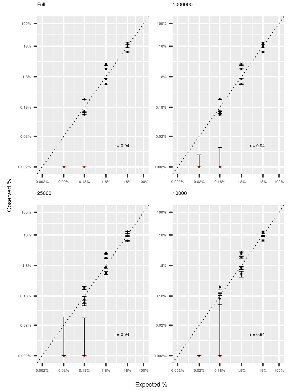 The effect of reducing sequencing depth on the accuracy of taxonomical classification was assessed by using the mock community, given its known composition. Expected and observed abundancies of the 20 mock species maintained a high correlation (r=0.94) even when decreasing sequencing to 10,000 reads (Figure 3). However, decreasing sequencing depth caused an increase in uncertainty, as shown by the broader confidence intervals for lower depths, particularly for rare species.
