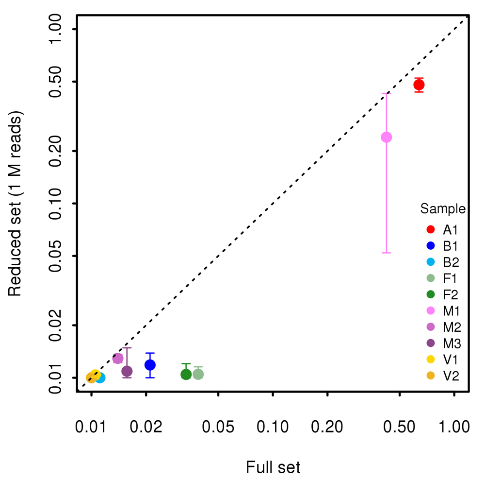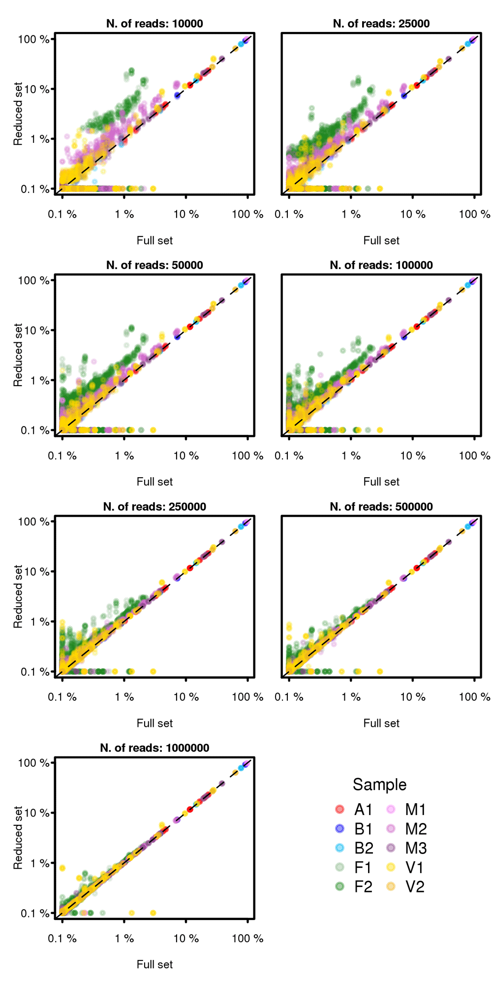 We also measured the correlation in species abundance between the full and reduced datasets in all the samples (Figure 4). The correlation between the two quantities was in general very good and improved at increasing sequencing depths. Pearson’s correlation coefficient between the two datasets was >0.95 in all subsampling replicates at all sequencing depths, with the exception of samples F1 and F2, for which the correlation reached 0.95 only for subsamples of 500,000 or more reads.