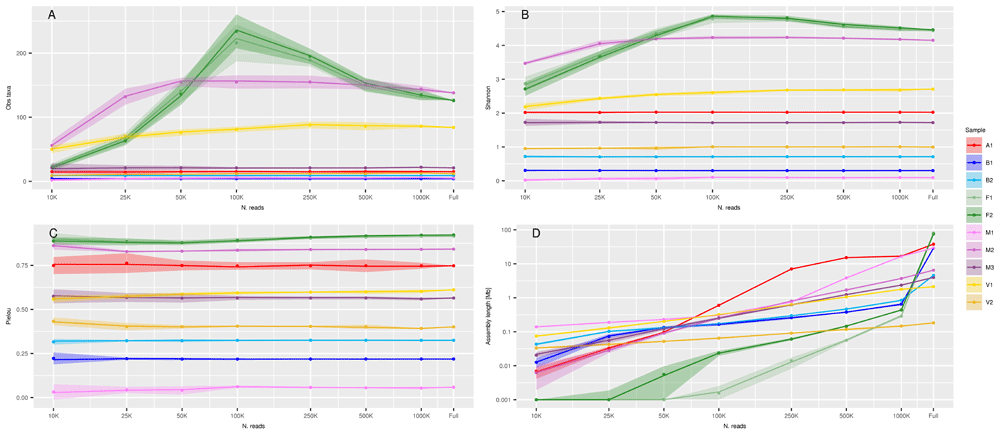 In summary, the aim of the present work is to test the effect of the reduction of sequencing depth on 1) estimates of diversity and species richness in complex matrices; 2) estimates of abundance of the species present in the complex matrix, and 3) completeness of de novo reconstruction of the genome of the species present in the samples. To assess the consistency of our approach, we selected samples characterized by different levels of species richness and by different relative abundance of prokaryotic and eukaryotic organisms and viruses.