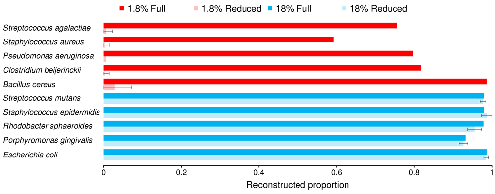 Error bars represent 95% confidence intervals based on five subsampling experiments. 1.8%: Species with nominal abundance of 1.8%; 18%: Species with nominal abundance of 18%; Full: results using full set of reads; Reduced; results using a subsample of 1,000,000 reads.
