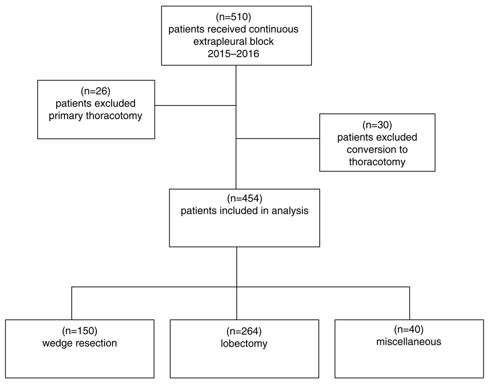 A thoracotomy was performed as the primary procedure in 26 patients. The remaining 484 patients were scheduled for VATS procedures. In 30 cases VATS was converted to thoracotomy. Neither patients that underwent primary thoracotomy nor patients converted to thoracotomy are included in our analysis. Of 454 cases analysed, 150 procedures were classified as wedge resection, 264 cases as lobectomy and the remaining 40 cases as miscellaneous (thymus resection, extirpation of a nodulus, lymph node(s), cyst or hamartoma and decortication with or without wedge resection) (Figure 1).