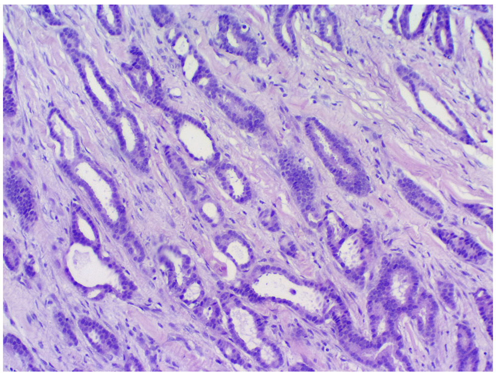 The right breast histopathological assessment. Histopathological examination showed an infiltrating duct carcinoma (Figure 3), with a Nottingham combined histopathological grade of 1/3 (tubules 1, pleomorphism 2 and mitoses 1). Estrogen and progesterone receptors were expressed diffusely within the tumour cells (Figure 4). Foci of low-grade cribriform ductal carcinoma in situ were also evident (Figure 5). The PSA immunochemistry staining was negative confirming primary breast carcinoma.