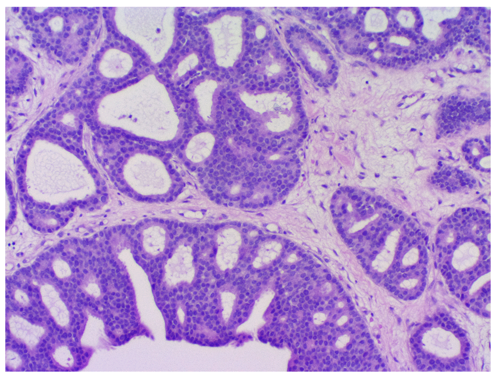 Core biopsy of the right breast (December 2016). Pathological diagnosis: Infiltrating duct carcinoma displaying cribriform features.