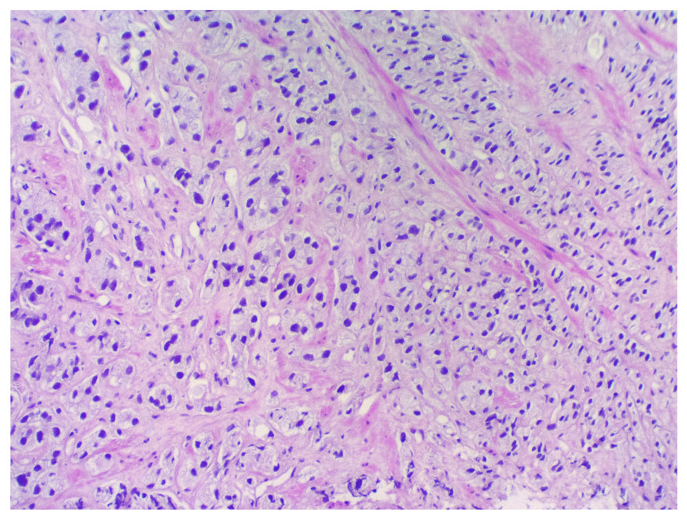 Prostate biopsy. Biopsy results showed an invasive prostatic adenocarcinoma (Figure 6), with a modified Gleason score of 9, and grade group 5, which was infiltrating into skeletal muscle (Figure 7). The proportion of tumour infiltration was >90% within the cores. There were areas of lymphatic invasion and perineural invasion.