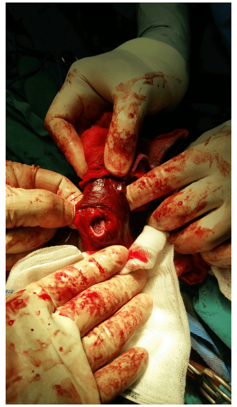 Cefazoline 2gr IV was administered prophylactically before surgery. Emergency exploration was performed 4 hours post-penile injury. A 16 Fr. Foley catheter was placed without difficulties. Then a circumcision was made, and surgical exploration was performed. On degloving the penile skin, a fracture on each corpora cavernosa was found. The length of the right and left defects were 25mm and 35mm, respectively (Figure 2). In order to protect the urethra, a Penrose drain was used as a vessel loop through the double fracture separating it from the site of injury (Figure 3). Repair of the two lacerations was done using 3-0 Vicryl in a continuous suture pattern. The Foley catheter was removed the next day without adverse events. The patient had a favorable recovery and was discharged three days after the surgical procedure without any complication (Figure 4).