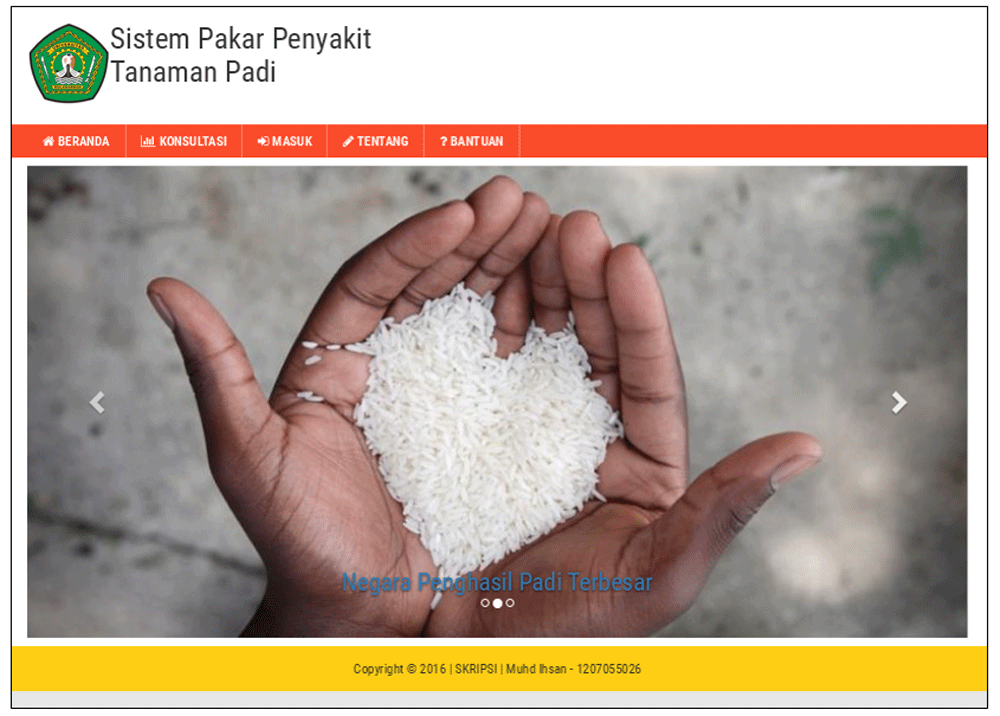 The ESforRPD2 application is showing good reliability. By applying 16 tests, the ESforRPD2 showed a level of performance of 87.5% (Table 1) following justification to two rice plants diseases experts. The performance of the ESforRPD2 during validation was the expected high-performance level of plant diseases diagnosis by the expert system. This performance is much higher than the performance of ES for Chili pepper pest diagnosis invented by Agus et al.16. However other Expert System could show excellent performance of 98.38%19, this evidence advice that the performance of ESforRPD2 could be improved in the next study.