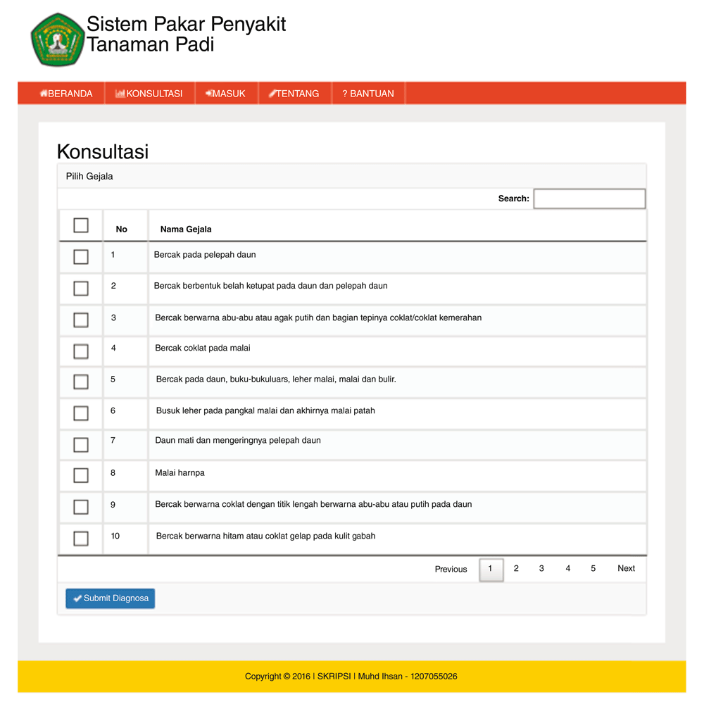 Along with other rapid technological developments, a technology known as Expert System (ES)5–8 has been developed to solve health9–12, education13, and business14, including agriculture15,16, problems. ES is usually designed for a specific condition, i.e. variables of climate in cases of agriculture. This article proposes a new software based on ES for the diagnosis of disease in rice plants in the Samarinda region, Indonesia. Waterfall Paradigm applied in designing this ES. The prototype, Expert System for Rice Plant Disease Diagnosis (ESforRPD2) is available at: http://esforrpd2.blog.unmul.ac.id.
