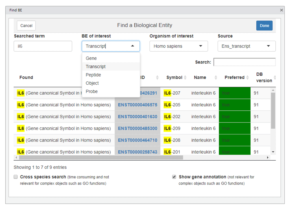 Some additional use cases and examples are provided in the BED R package vignette. Several functions are available for annotating BEID with symbols and names, again taking advantage of information related to connected identifiers. Other functions are also provided to seek relevant identifiers of a specific biological entity. These functions are used by a shiny (Chang et al., 2017) gadget (Figure 6) providing an interactive dictionary of BEID which is also made available as an Rstudio add-in (Allaire et al., 2017; Cheng, 2016).