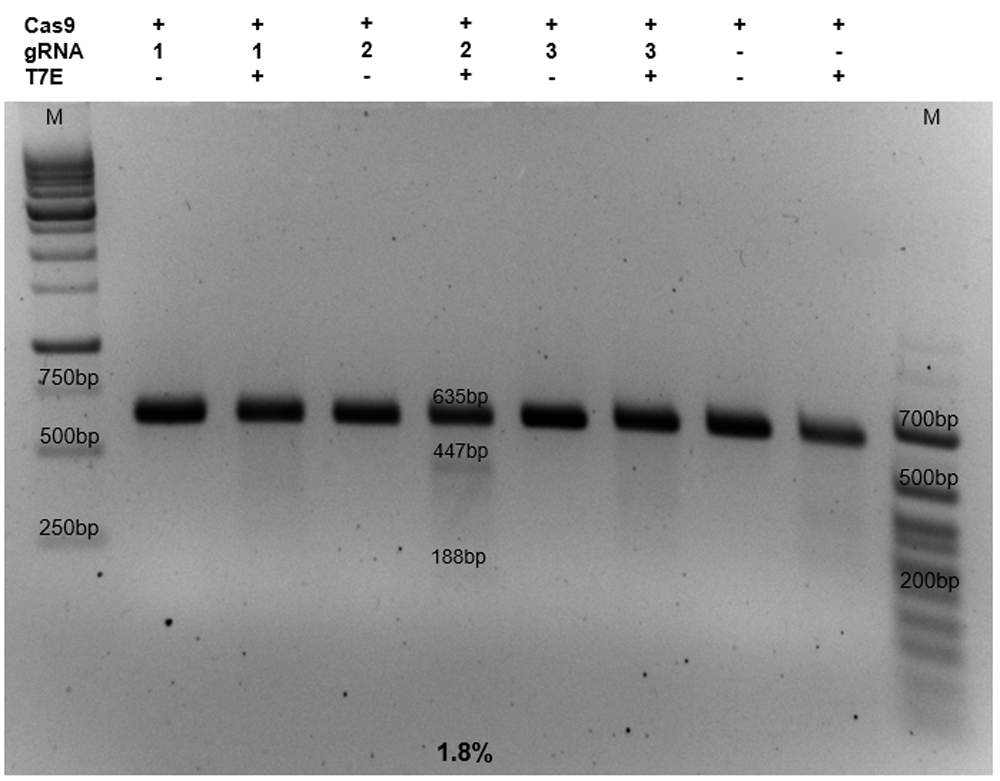 Genomic DNA was extracted from the cells, and T7 endonuclease I (T7EI) assay demonstrated that only gRNA2 in complex with Cas9 had activity in DF1 cells with the targeting rate around 1.8% (Figure 2).