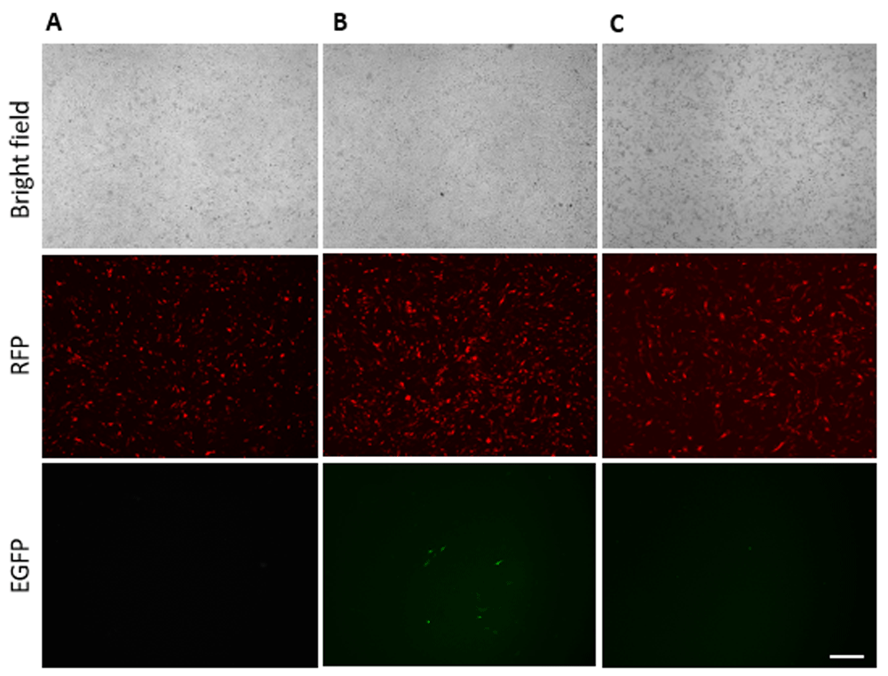 (A) 72h after transfection; (B) 15 days after selection; (C) 1 month after selection. Scale bar = 200 µm. Figure is representative of five technical repeats.