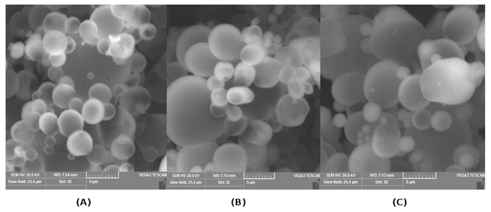 SEM analysis reveals that all DMEO-loaded nanocapsules are mostly spherical (Figure 1). As the polymer content increased, the encapsulation efficiency and mean particle size also increased, as seen in Table 1, suggesting that nanoencapsulation minimized deactivation of the drugs during the delivery process due to the protection from the polymer shell. This might ensure sufficient amounts of drug reaching the targeted areas. ERL is a copolymer of partial esters of acrylic acid containing low amounts of a quaternary ammonium group. ERL is a water-soluble polymer that plays a crucial role in controlling drug release because its water uptake characteristic contributes to the swelling of the polymers.