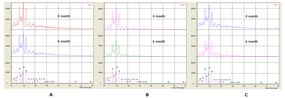 (A) X-ray diffraction patterns of DMEO-loaded nanocapsules of F1 after 0 and 6 months of storage (B) X-ray diffraction patterns of DMEO-loaded nanocapsules of F2 after 0 and 6 months of storage (C) X-ray diffraction patterns of DMEO-loaded nanocapsules of F3 after 0 and 6 months of storage.
