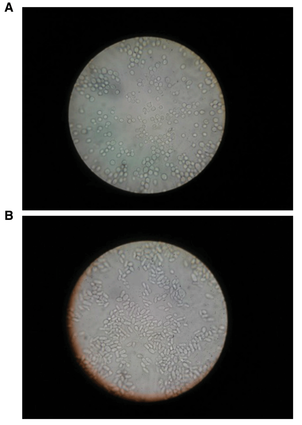 A compound microscope (Model-CX-21, Olympus, Japan) was used to observe the cell morphology and the presence of yeasts were confirmed which were isolated from sugarcane juice (Figure 1A) and date juice (Figure 1B) (named SC1 and DJ1 respectively). Identification of each isolate of yeast up to species level was carried by the methods demonstrated by Kreger-Van Rij (1984)9 based on the morphology, sporulation and fermentation characteristics, as well as the assimilation of nitrogen and a range of carbon sources. Yeast specific API® identification kit (bioMérieux, Marcy-l'Étoile, France) was also used by inoculating 48-hrs culture broths into the chambers according to the protocol.
