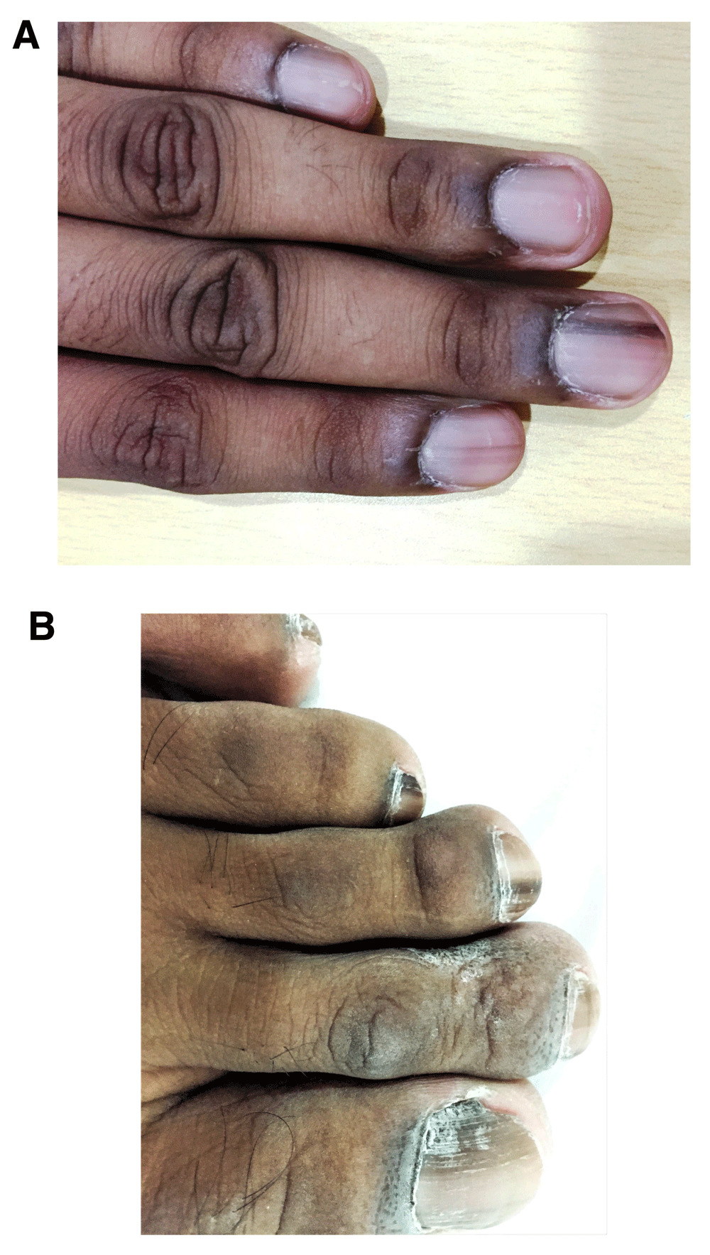 A 19-year-old Indian gentleman was evaluated for asymptomatic patchy pigmentation over multiple finger and toe nails, the tongue, and buccal cavity, noticed eighteen months back. There was no history of preceding trauma, drug intake, soreness of mouth, or dental procedures or amalgam filling. He denied addictions like smoking or chewing of betel nut or tobacco. Current and past medical history were unremarkable. There was no history of parental consanguinity, familial nail pigmentation or any familial pigmentary disorder. Examination of oral mucosa revealed poor oral hygiene. The dorsum of the tongue revealed violaceous to dark grey discoloration extending onto the ventral surface, interspersed with white reticular lesions and focal tiny bright red erosions (Figure 1). Buccal mucosae revealed brown colored macules with focal presence of white reticular lesions. Lingual papillae projections appeared blunted in the discolored central area. Although mild desquamative gingivitis with gingival hyperpigmentation were appreciable, the lips were spared with no visible freckling (Figure 2). Examination of nails revealed longitudinal melanonychia of multiple fingers and toe nails (Figure 3). Relevant hematological and biochemical investigations ruled out hepatitis, dyslipidemia, diabetes and thyroid disorder.