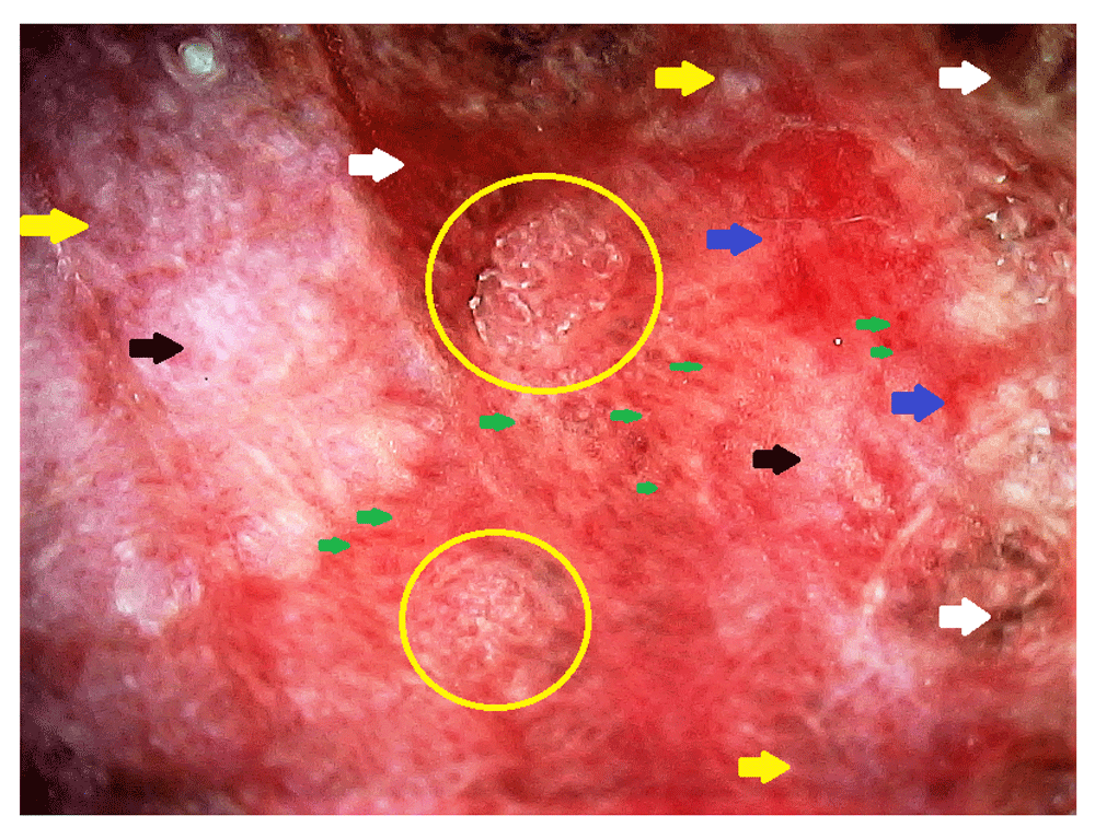 dermoscopy, mucoscopy, lichen planus, oral, mucosal, leukoplakia, veil-like, speckled-pearly erosion, dotted, linear, curvilinear, vessels, clods, brown