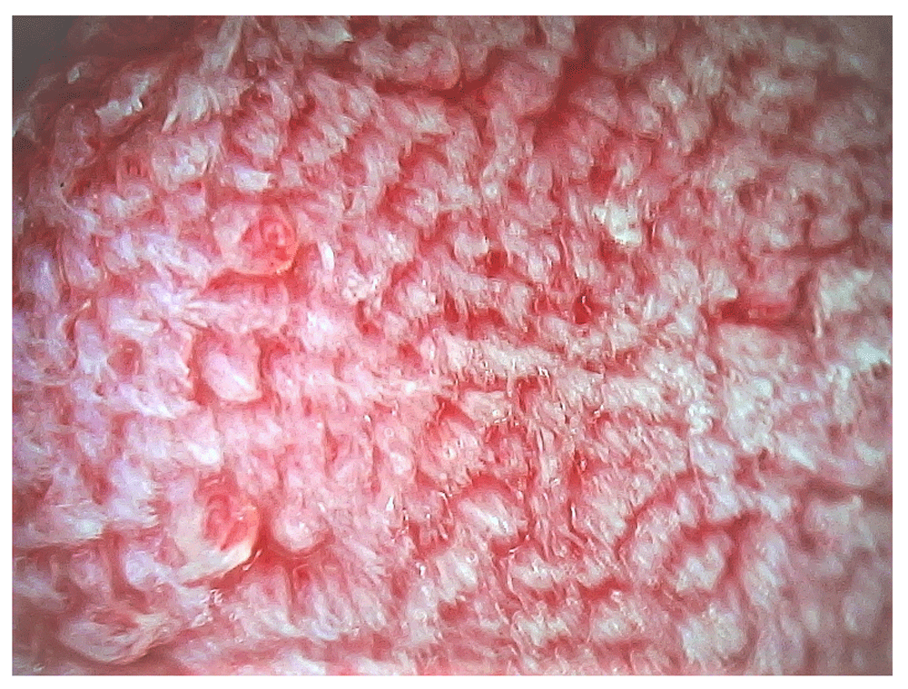 Video dermoscopy (EScope; polarized mode, ×20) of the dorsum of the tongue revealed blunting of papillae (Figure 4), in contrast to the preserved papillary pattern observed in the peripheral portion (Figure 5). The affected area displayed a tri-color pattern constituted by – 1) structureless veil-like grey-white to bluish-white areas, 2) bright red slightly depressed areas, and 3) interspersed violaceous-to-brown clods. A few foci of specked-pearly white structures were also observed (Figure 4). Dotted and linear to curvilinear vessels were visible at the junction of the white and red areas. Dermoscopy from the surrounding normal-appearing areas of the tongue dorsum revealed the typical fungiform lingual papillae (Figure 5). Dermoscopy from buccal mucosa only revealed diffusely spread violaceous clods. Onychoscopy revealed multiple 3–4 mm wide uniformly pigmented parallel linear bands of pigmentation with pseudo-Hutchinson sign (Figure 6).