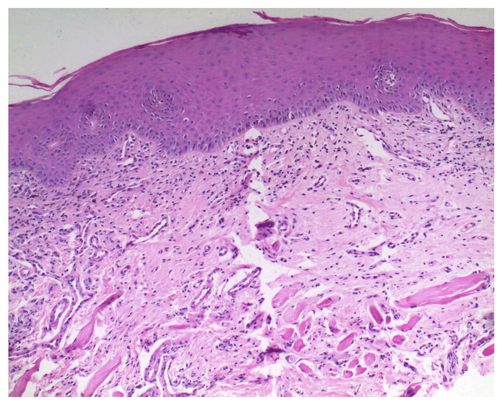 A 10% KOH smear from the oral mucosa was negative for candidiasis. Histopathology revealed irregular acanthosis, basal layer vacuolization, necrotic keratinocytes, moderately dense interface dermatitis .and pigment incontinence (Figure 7). A final diagnosis of erosive oral lichen planus was made.