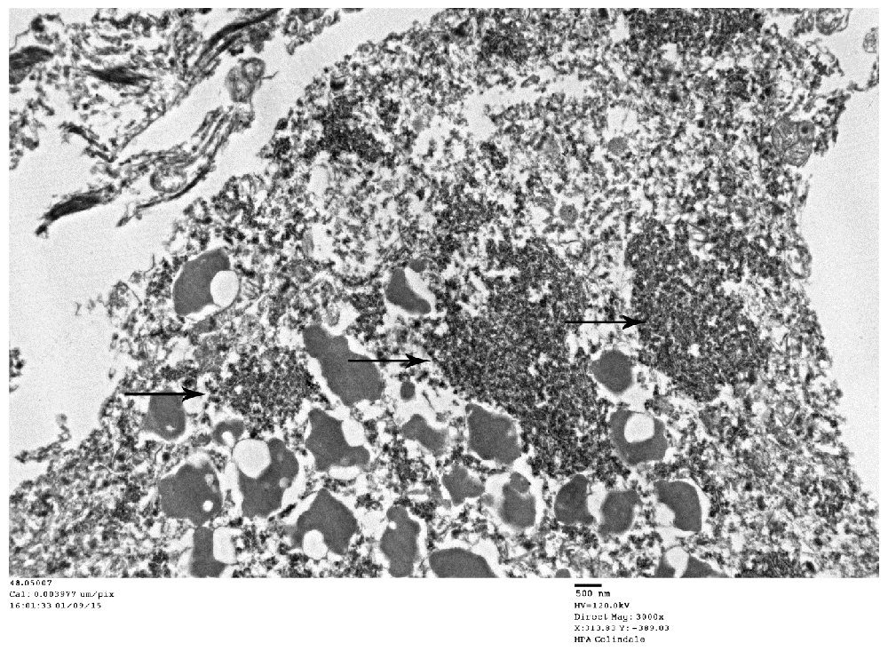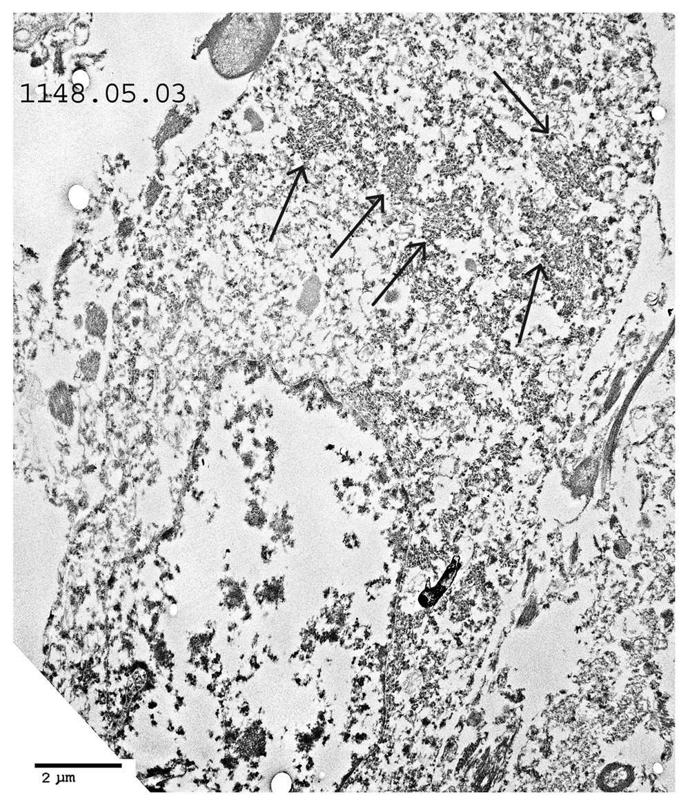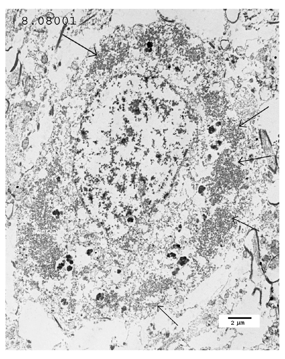 Low magnification of a neuron in the substantia nigra. The nucleus is almost devoid of chromatin and the remaining chromatin is clumped. Many virus factories are present in the cytoplasm (arrows). The black granules in the cytoplasm contain melanin. A high magnification of this image that shows intranuclear VLP is in Figure 4.