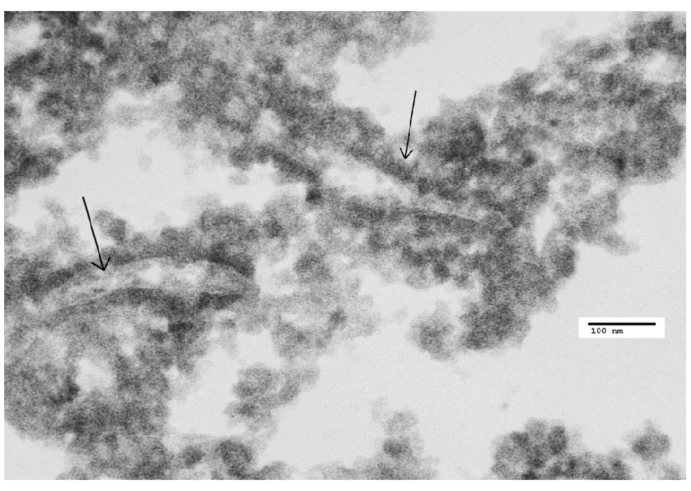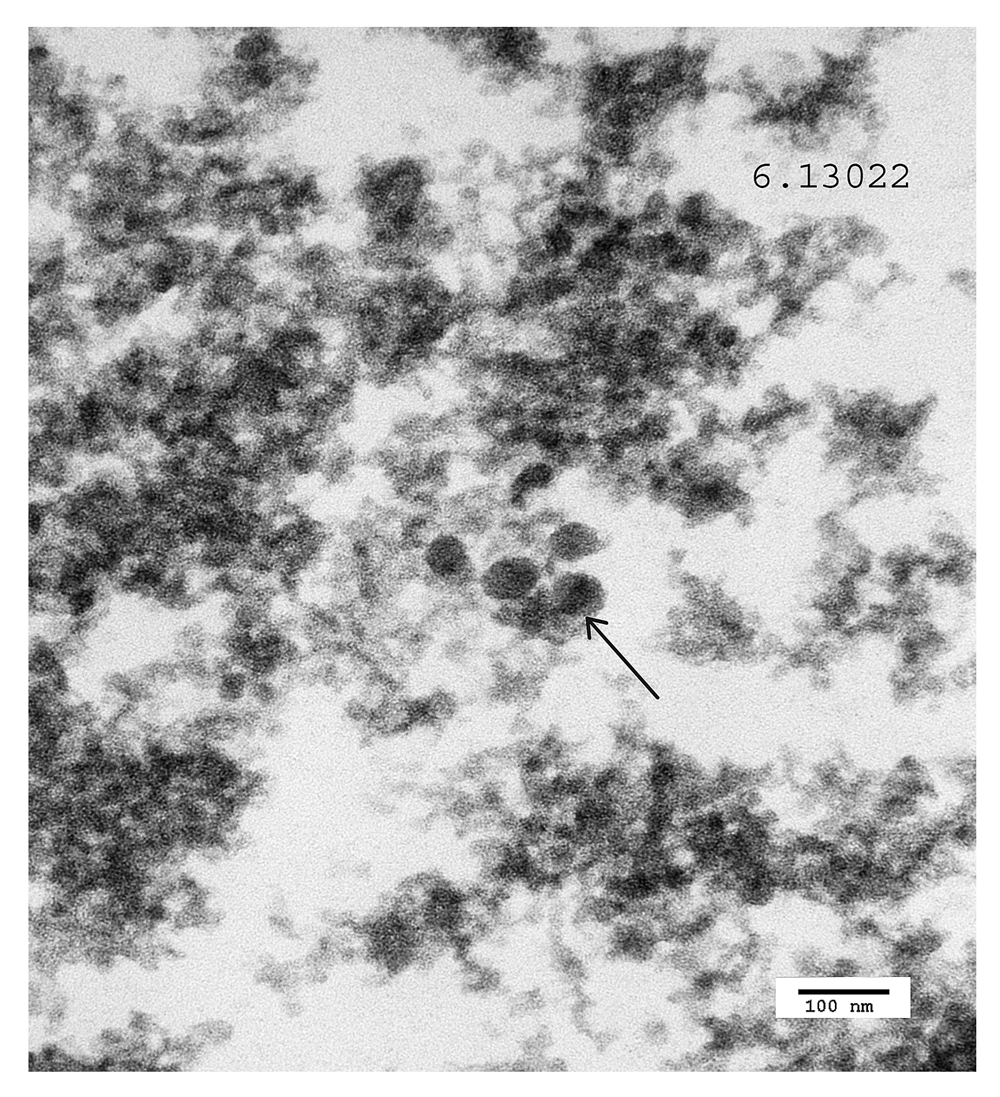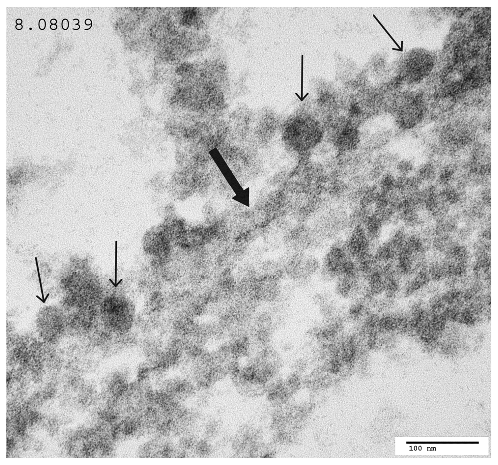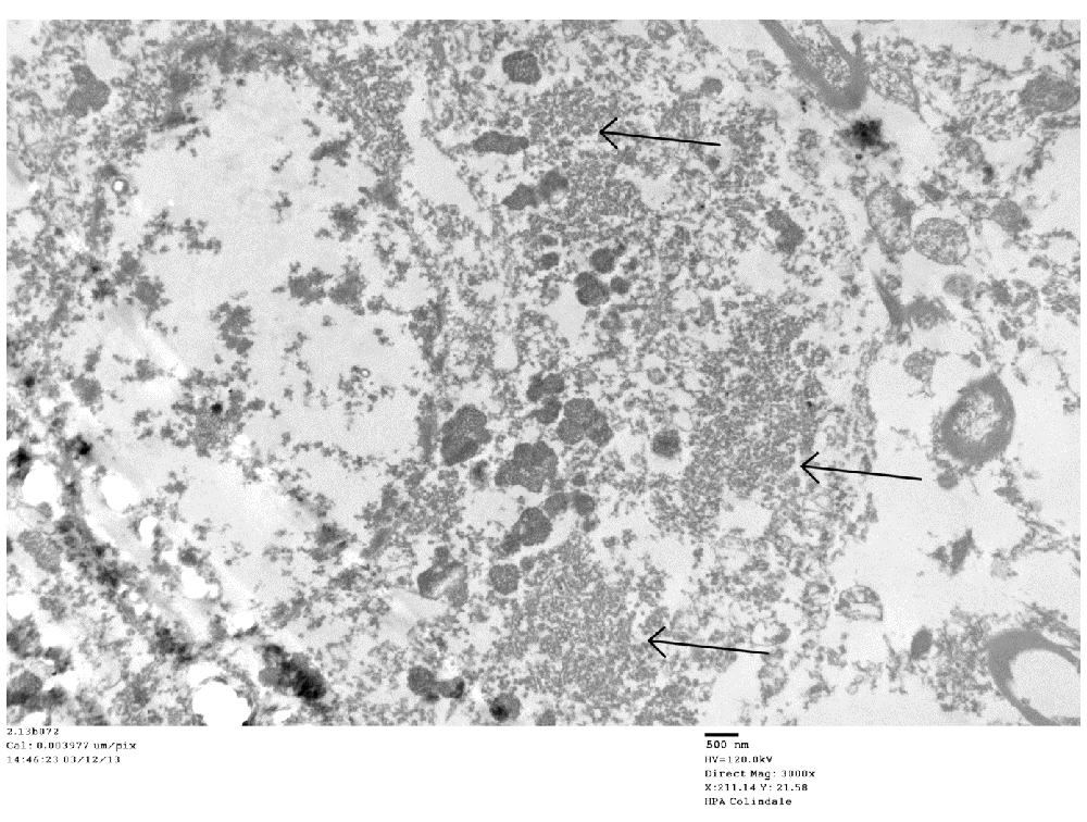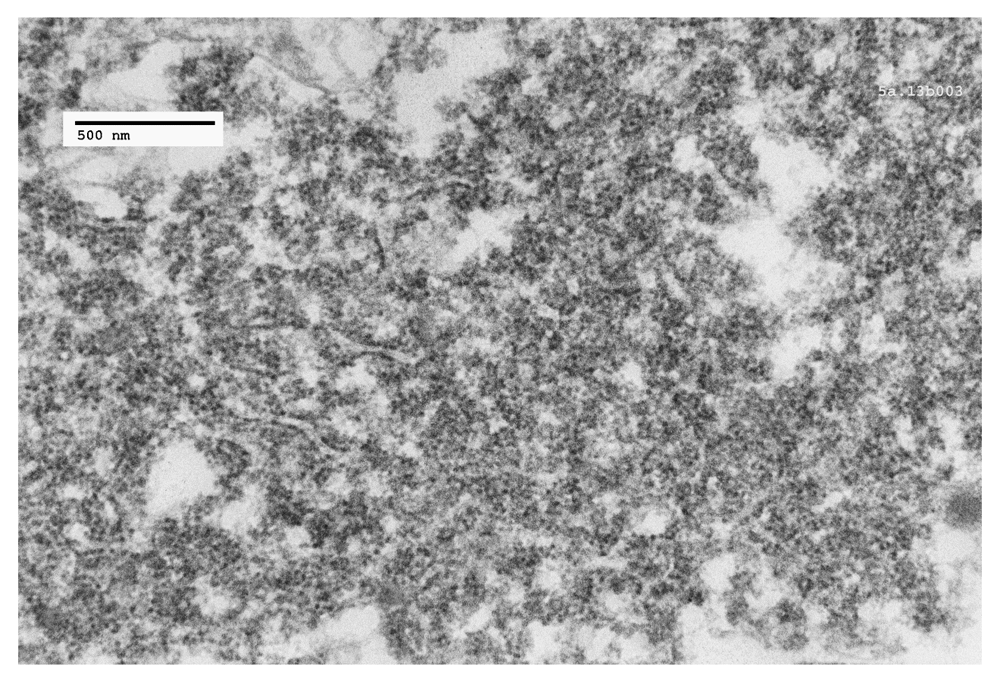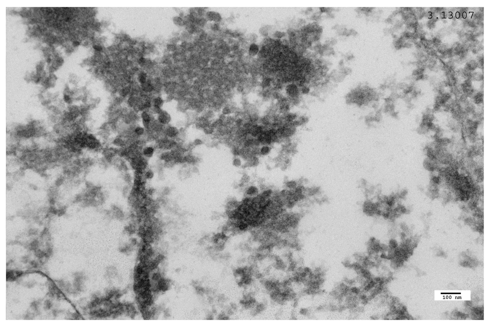 A Lewy body is illustrated from a case of PD (Figure 12). In this image, the nucleus and cytoplasm of the neuron was completely destroyed. There were no VLP associated with the Lewy bodies.