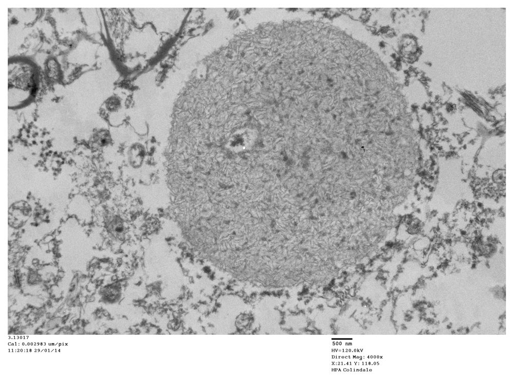 The TEM images presented here are listed in the legends by the author’s TEM serial number followed by the donor’s autopsy number. Copies of the images are stored at the Public Health England electron microscopy laboratory. They may be freely obtained by contacting Dr. Matthew Hannah at PHE.