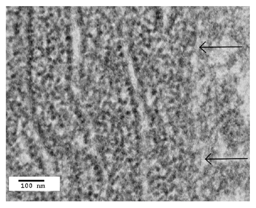 A virus factory in PD. There are endoplasmic reticulum membranes in this image (arrows). There are virus-like particles (VLP) that are larger than the ribosomes in control Nissl bodies. The mean diameter of the VLP in this image was 31 nm (see Table 1). The magnification has been adjusted to 200,000x so as to make the comparison of the diameters of VLP and that of the ribosomes more apparent. The magnification bar for 100 nm for these images = 20 mm.