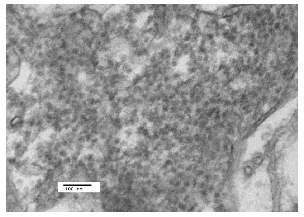 Image of control brainstem neuron showing cytoplasmic ribosomes (see Table 1). The magnification has been adjusted to 200,000x so as to make the comparison of the diameters of VLP and that of the ribosomes more apparent. The magnification bar for 100 nm for these images = 20 mm.