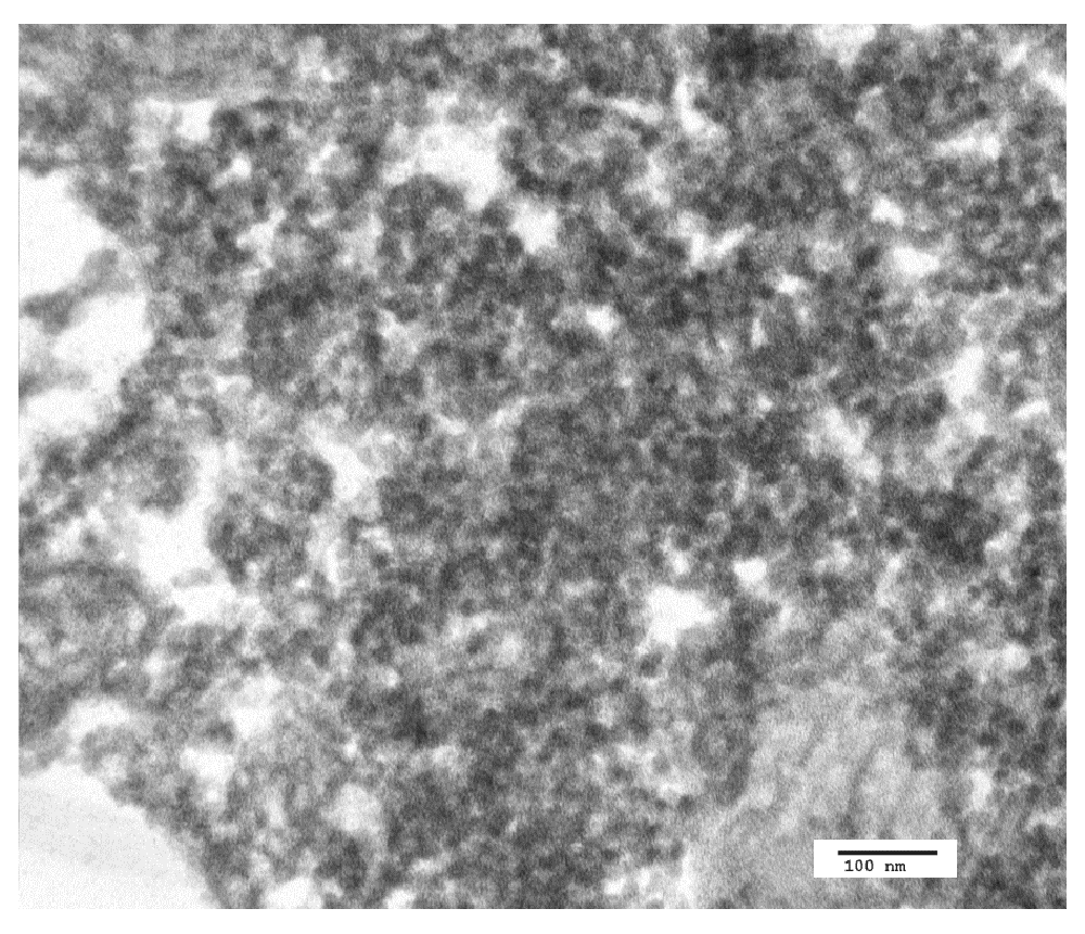 In the cytoplasm of a PD case, the virus factories consisted of masses of virus-like particles (VLP) in an amorphous matrix. Mean size of VLP: 30 nm (see Table 1). The magnification has been adjusted to 200,000x so as to make the comparison of the diameters of VLP and that of the ribosomes more apparent. The magnification bar for 100 nm for these images = 20 mm.