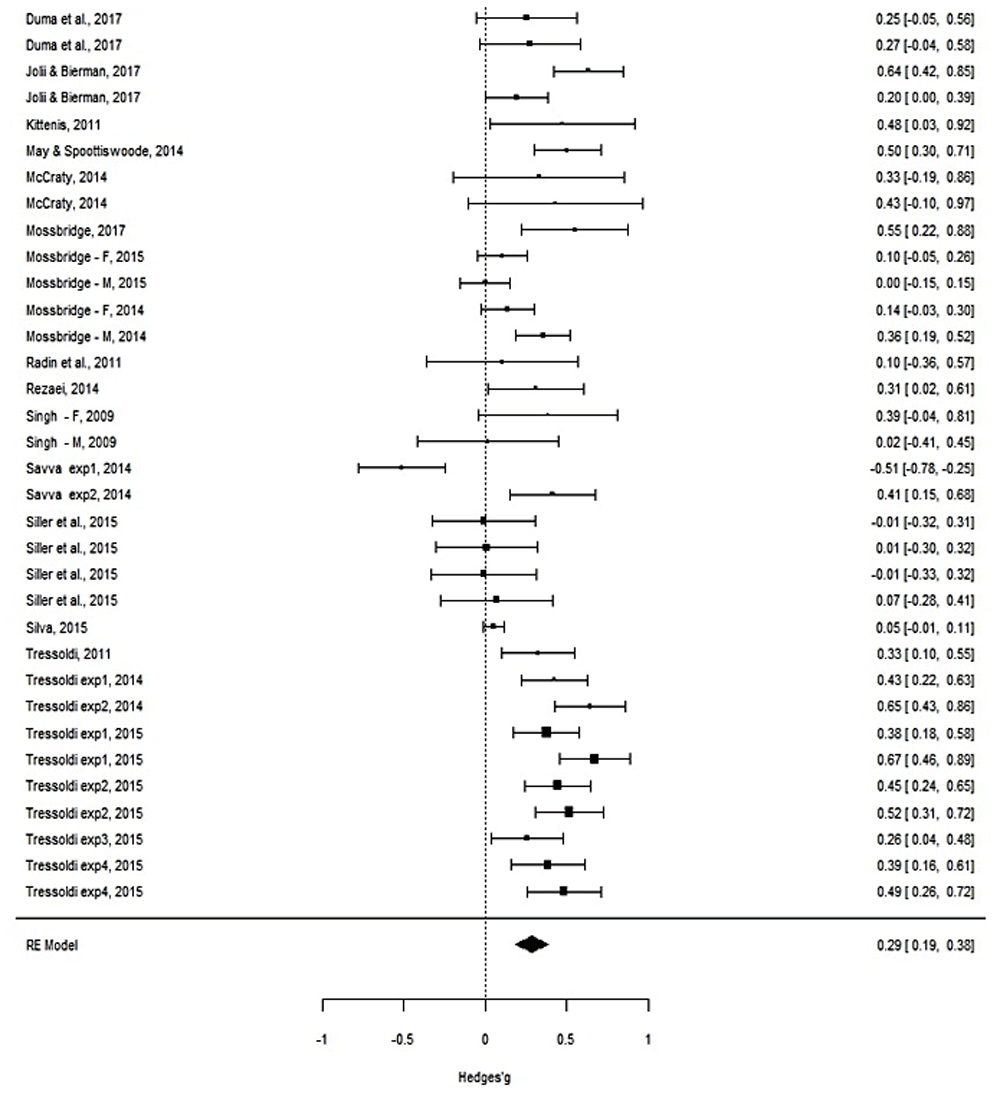 The high level of heterogeneity is expected considering the varieties of experimental protocols and the diversity of dependent variables, from heart rate to pupil dilation.