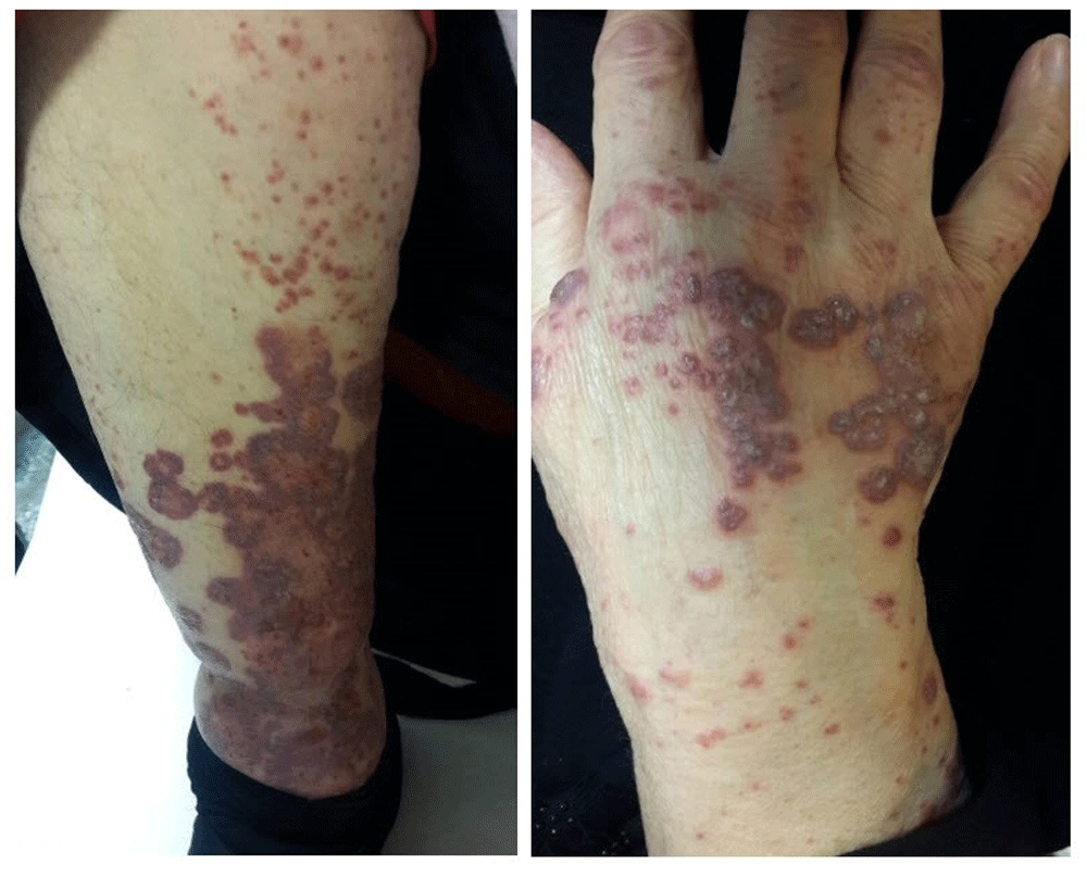 The patient was a 65 year old woman from the south of Iran that came to our hospital due to abdominal pain and skin lesion on right upper and right lower extremities, which were was mostly on the distal of extremities since 2 weeks preadmission. Other complaints of the patient were diarrhea, vomiting, chills, fever and anorexia. In the past medical history, the patient had diabetes, hypertension and Bell's palsy (treated with 40mg prednisolone daily).