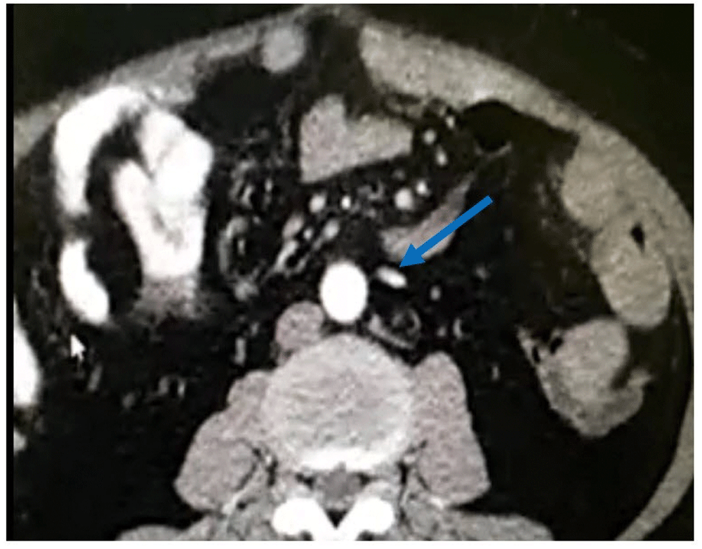 Narrow enhancement of the inferior mesenteric artery can be observed (blue arrow).