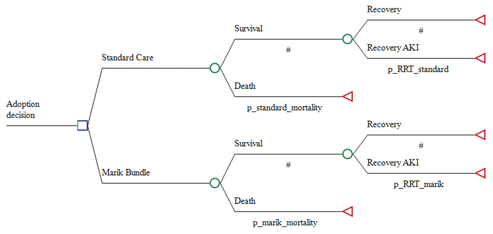 The transition probabilities of patients moving through the decision tree were informed by data from Marik’s study. This includes the probabilities of survival and AKI, see Table 13. In Marik’s study, the bundle’s probability of death and AKI were 0.085 and 0.097, with standard deviations of 0.041 and 0.043 respectively. These compared to the standard care mortality and AKI probabilities of 0.404 and 0.367, with standard deviations of 0.071 and 0.070 respectively.