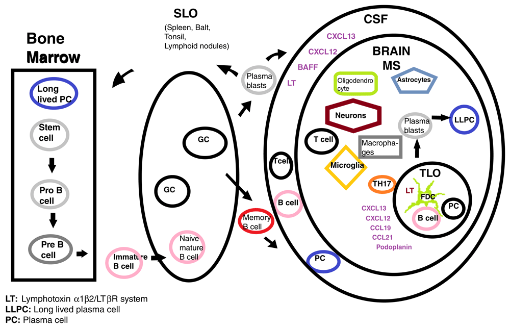 B-cells originating in the bone marrow exit toward the blood stream as immature B-cells; they enter the SLO and specialize in the germinal centers producing memory B cells and plasmablasts, which in pathologic conditions, are able to gain access to the CNS. The TLO is formed in the meninges during chronic inflammation in the deep brain cortical sulci and share organogenesis with the SLO6. Podoplanin and the Th17 signature cytokine IL-17 have been associated with ectopic lymphoneogenesis in human diseases whereas BAFF is a key factor for mutation and survival of B cells which is produced by astrocytes in the CNS1,3. BAFF: B-cell activating factor of the tumor necrosis factor family; Balt: bronchial associated lymphoid tissue; CCL19: chemokine (c-c motif) ligand 19; CSF: cerebrospinal fluid; CXCL13: chemokine (C-X-C motif) ligand 13; FDC: follicular dendritic cells; GC: germinal center; LT: lymphotoxin α1β2/LTβR system; LLPC: long lived plasma cells; MS: multiple sclerosis; PC: plasma cell; SLO: secondary lymphoid organ; TLO: tertiary lymphoid organ.