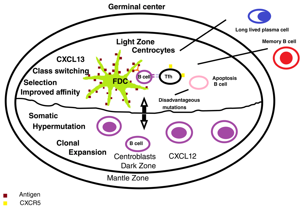 The induction of lymphoid chemokines, depends on lymphotoxin β (LT-β) and the tumor necrosis factor α (TNF-α) signaling on stromal cells and FDC22. Lymphotoxin α1β2 (LTα1β2) is expressed in the surface of B and T cells in the adult immune system and ligates to the lymphotoxin β receptor (LTβR) in reticular stromal cells thus inducing expression of lymphoid chemokines, such as CCL19, CCL21 and CXCL1323. These chemokines regulate the homeostatic traffic of lymphocytes in lymphoid organs and their distribution in the GC23. Homeostatic chemokines promote secretion of LTα1β2 by T and B cells, establishing a feedback loop that perpetuates the recruitment of lymphocytes and positional organization in the GC1. The chemokine CXCL13 has the following relevant properties: