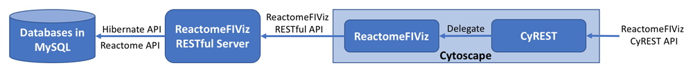The ReactomeFIViz CyREST API is powered up by the CyREST app using its embedded light-weight Grizzly HTTP server. CyREST delegates all RESTful API calls to ReactomeFIViz, which then calls the ReactomeFIViz RESTful server via its RESTful API. The ReactomeFIViz server fetches the Reactome content from databases hosted in a MySQL database engine via a Hibernate API and the in-house built Reactome Java API (Figure 1).