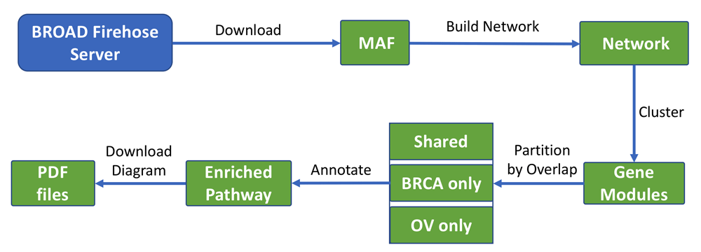 Figure 2 shows the workflow of this use case. The TCGA BRCA (breast invasive carcinoma) and OV (ovarian serous cystadenocarcinoma) mutation data was downloaded from the Broad firehose web site in the mutation annotation file (MAF) format using its RESTful API, and stored in two local files, one for each cancer type. The MAF was then loaded into Cytoscape via the CyREST API to construct a FI sub-network after choosing a sample cutoff to select genes forming a network composed of about 500 genes. The FI-network was then subject to network clustering analysis. Two sets of network modules from network clustering were compared to find modules shared and not shared between these two cancers. Pathway enrichment analysis was performed to collect pathways not shared between them. These results suggest common and cancer-specific network and pathway patterns, facilitating researchers to understand shared and specific oncogenesis mechanisms in these two cancers.