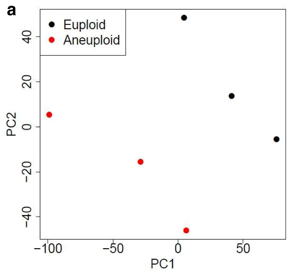 PCA suggests gene expression for euploid yeast samples (haploid) clusters distinctly from that of the aneuploid yeast samples (diploid chromosome X). The first two Principal Components account for ~70% of the variance in expressed genes). Data provided by Mulla et al., 2017.