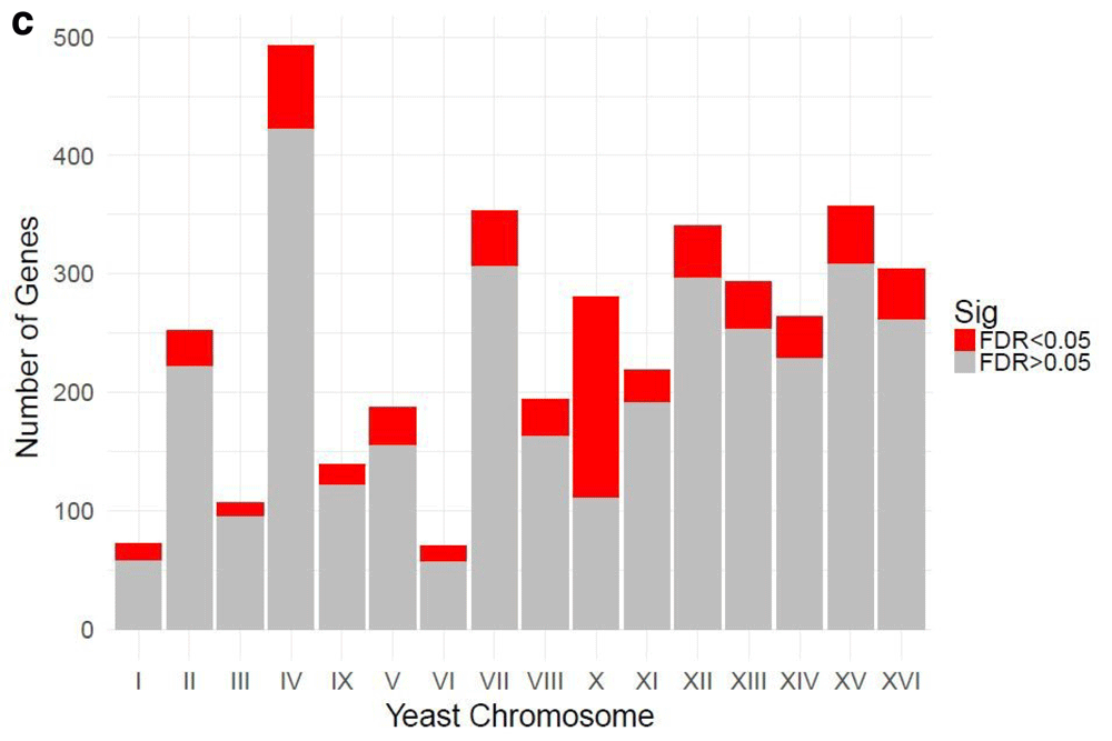 The relative enrichment of chrX for differentially expressed genes suggests the downstream results of this processing pipeline are consistent with biological expectations. The RNA-seq experiment was performed on yeast colonies with an extra chromosome X. Data provided by Mulla et al., 2017.