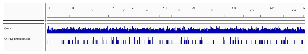 This IGV screenshot shows in the bottom row the intersected peaks between the two treatment conditions of the yeast samples. The matching genes with each intersected peak can be analyzed. Data provided by Rawal et al., 2018.