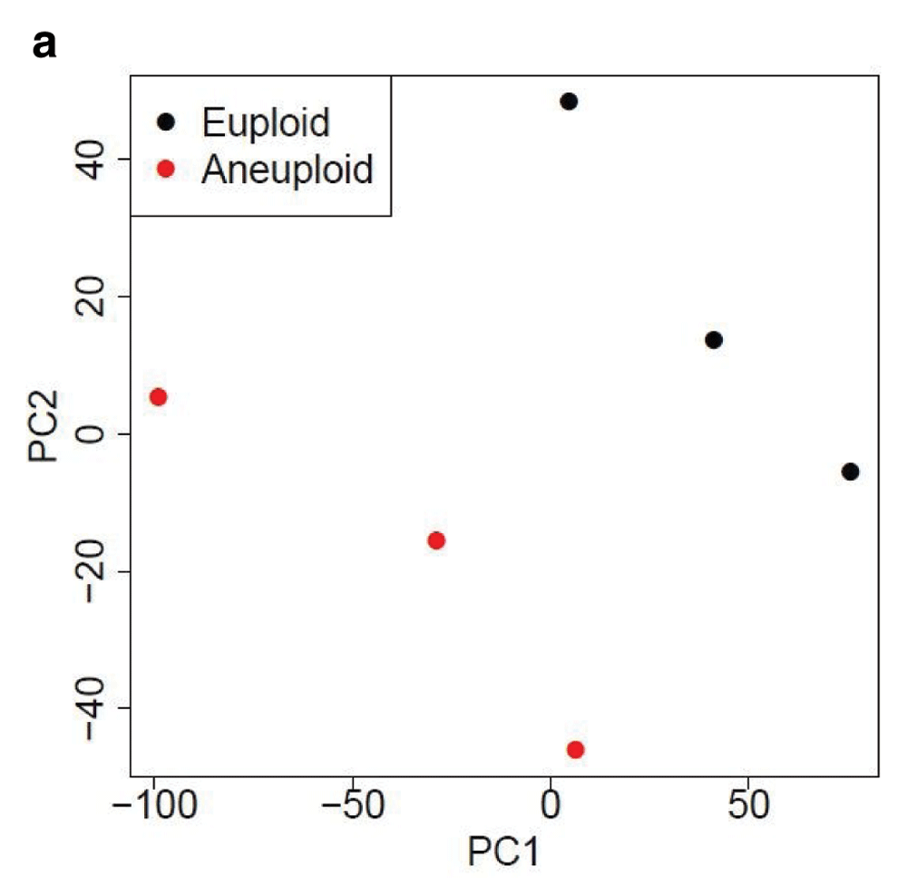 PCA suggests gene expression for euploid yeast samples (haploid) clusters distinctly from that of the aneuploid yeast samples (diploid chromosome X). The first two Principal Components account for ~70% of the variance in expressed genes). Data provided by Mulla et al., 2017.