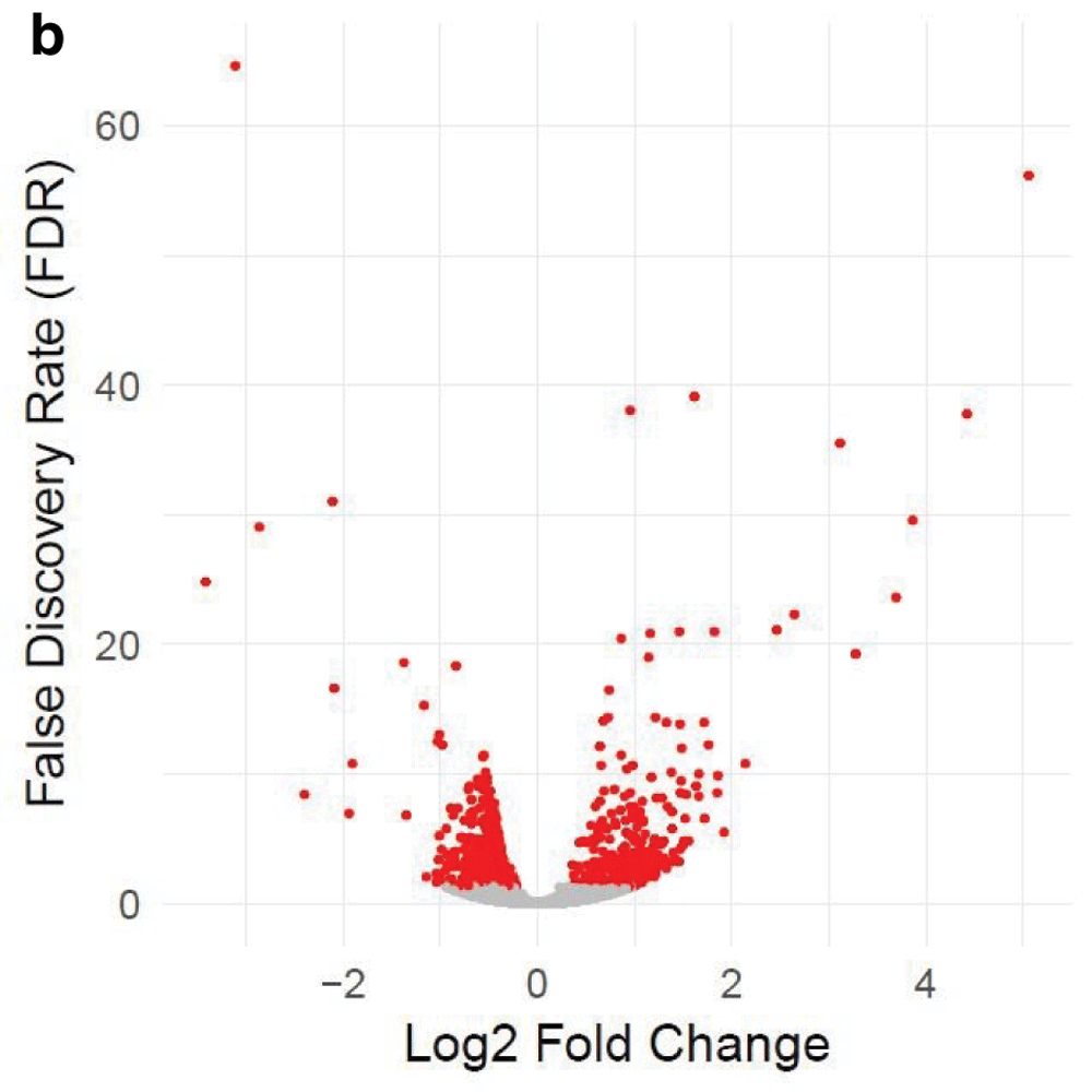 The x-axis represents the difference in gene expression between the conditions. False discovery rate (FDR), a method for controlling for multiple testing, is along the y-axis. Each point represents a tested gene (N=3,926). Red points are those reaching genome-wide significance (at FDR<0.05, N=663), whereas grey points are genes not reaching statistical significance (FDR>0.05, N=3,263). Data provided by Mulla et al., 2017.