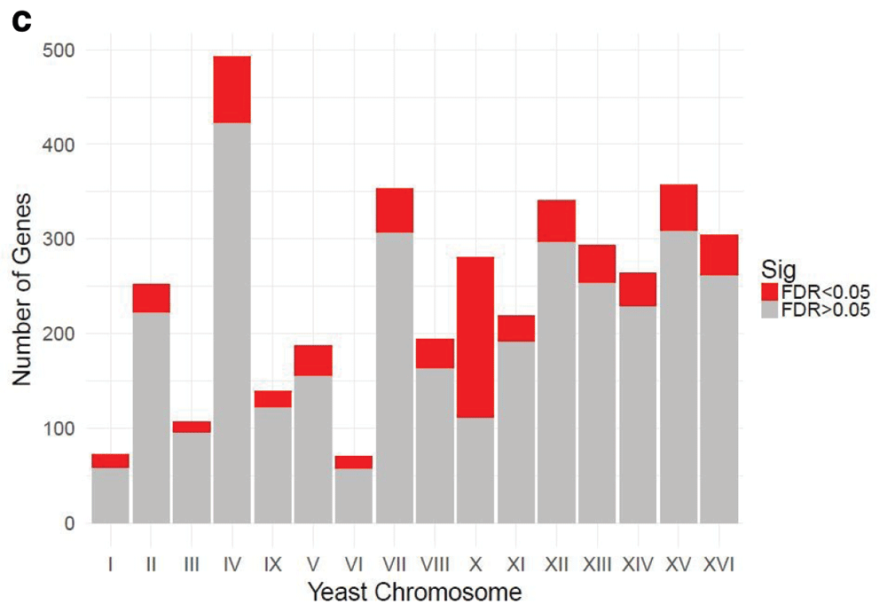 The relative enrichment of chrX for differentially expressed genes suggests the downstream results of this processing pipeline are consistent with biological expectations. The RNA-seq experiment was performed on yeast colonies with an extra chromosome X. Data provided by Mulla et al., 2017.