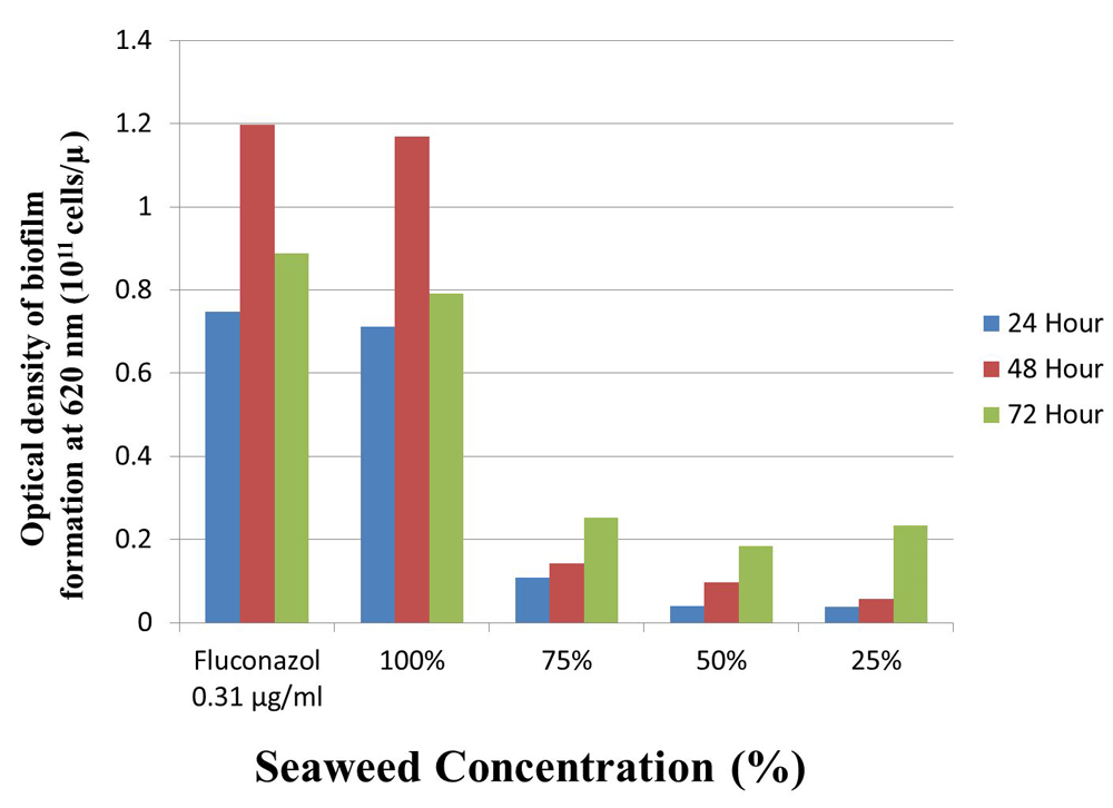 The study showed that 25–75% seaweed extracts are promising for inhibiting the growth of C. albicans as shown by much lower biofilm formation after 24, 48 and 72 hours exposure compared to those caused by positive control (fluconazole) and 100% seaweed extract. This indicated potential of seaweed extract as natural anti-fungus to treat oral candidiosis caused by against C. albicans in smokers.