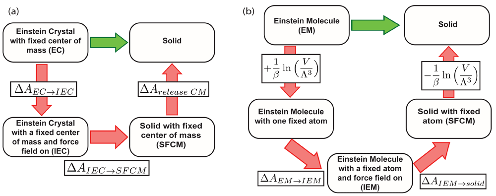 (a) Thermodynamic cycle representing the Einstein Crystal Method. (b) Thermodynamic cycle representing the Einstein molecule method (EMM). Note that the EMM requires only two free energy calculations despite being a bigger thermodynamic cycle. The canceling terms in (b) correspond to the free energies of fixing and releasing one atom in the crystal lattice48.