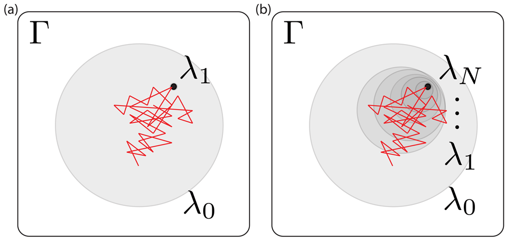 Γ represents the phase space that contains all the configurations for all the states in the path. λ0 and λ1 (left) or λN (right) represent the end states along the path, each shaded region represents a state in phase space and the red lines represent the configurations visited by the simulation run in the λ0 state. The restrained state is a subset of the unrestrained one. (a) and (b) represent simulations with different numbers of intermediate states along the path between a fully restrained state (λ1 (a) or λN (b)) and an unrestrained state (λ0). In (a), the simulation (red) only visits very few configurations consistent with the restrained state – i.e, there is poor phase space overlap – indicating a need for more intermediate states, otherwise any free energy estimates will be subject to very high uncertainties; in (b) there is still almost no overlap between the simulation and states consistent with λN, but there is overlap with the next shaded region, λ1, indicating the potential for overlap and accurate free energy estimates. Thus simulations run in each shaded region are more likely to have a bigger phase space overlap with λN than simulations run in λ0.