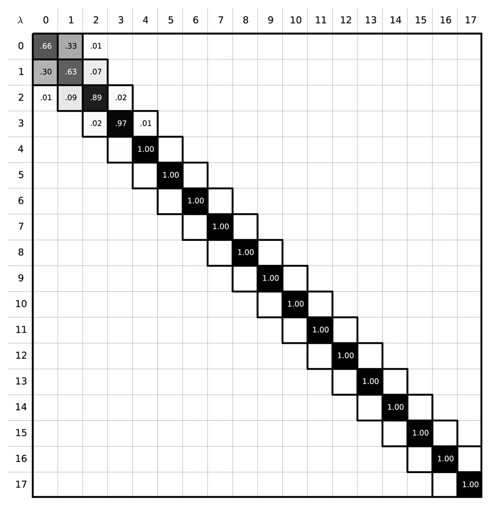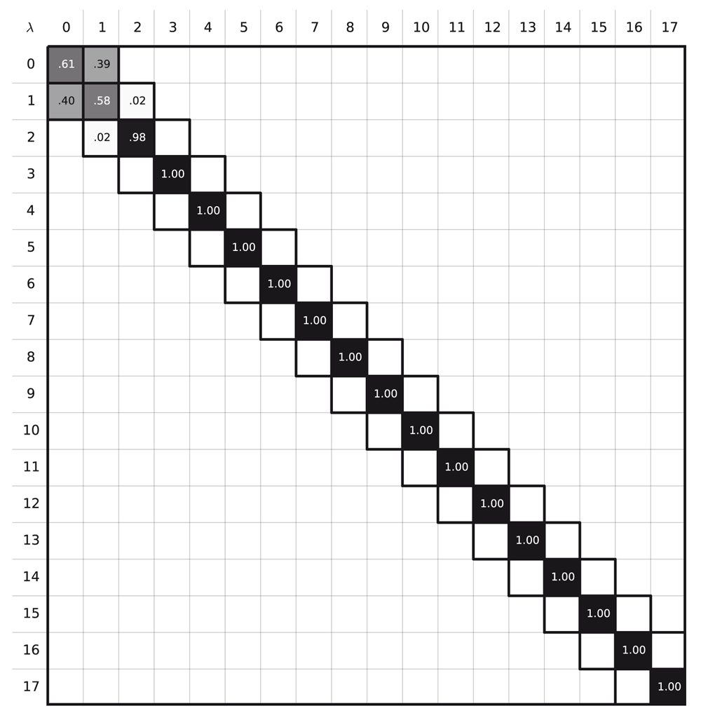The sum of all the elements in a row should yield 1.0, a probability of 100%. A good free energy estimate is obtained when the states along the alchemical path contain configurations that can be found in other intermediate states. In these situations, the phase space overlap is non-zero, which results in non-zero off-diagonal elements. Here, however, the phase space overlap plot shows that there is no overlap between the states λi, 4 ≤ i ≤ 17 indicating poor free energy estimates will result.