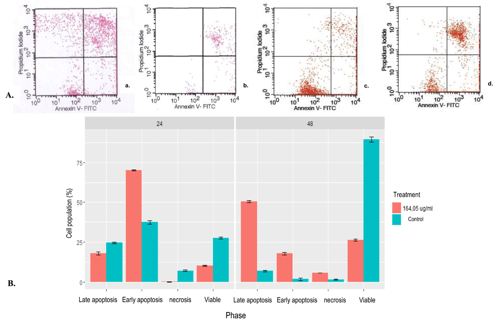 A flow cytometry was used to analyze tubes containing cells with and without extract material after 24 and 48 hours exposures. Cultures of HSC-2 and HSC-3 cells with 1×105 cells/mL concentration were centrifuged for five minutes with 500 rpm speed, washed with 1 mL cold PBS (10010031, ThermoFisher Scientific), and re-centrifuged for five minutes and vortexed. One hundred µl test solution containing 1x105 cells in each tube is resuspended with binding buffer. 5 µL FITC Annexin V (556547, BD PharmingenTM) and 5 µL PI (556547, BD PharmingenTM) stains were added to these cells and incubated for 15 minutes in a dark place, analyzed by flow cytometry (BD FACS Calibur Flow cytometry System type E 34297502328, .San Jose, California, USA) and by manual gating using CellQuest software (Becton Dickinson, NJ). Gating was performed on blinded samples