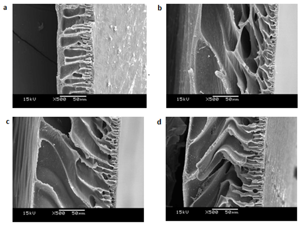 As shown in Figure 3a, the original PVC membrane has an upper layer that is thicker than the upper layer structure after the addition of PF127. The exchange of solvent from the polymer solution to the coagulation bath occur slowly in the case of the original PVC membrane, and contribute to the formation of a thick upper layer that is larger than in the other systems14. After the addition of PF127, the membrane surface becomes more hydrophilic and the affinity between the casting solution and water increases, so the polymer solution will attract more water and the diffusion process of water into the polymer matrix will be faster15. As a consequence of this mechanism, large macrovoids and a thin upper layer are formed. In other words, the increase in the PF127 concentration results in larger pores and a thinner upper layer of the membrane.