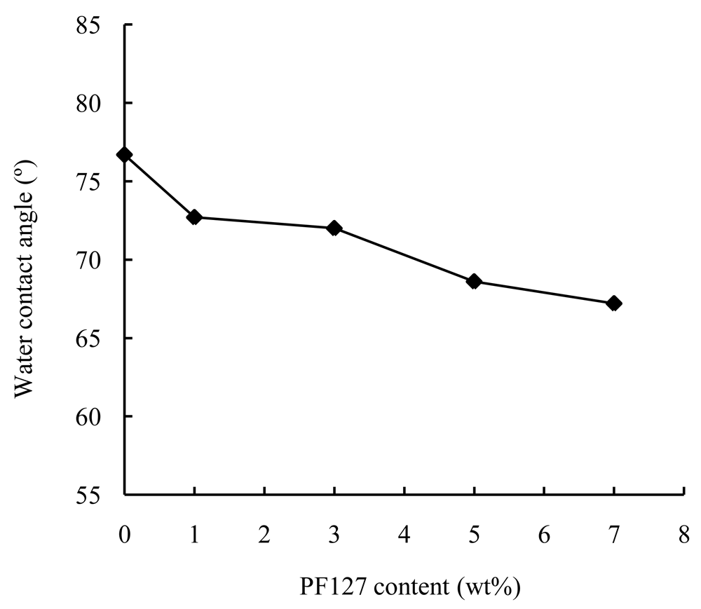 The measurement of the water contact angle is the simplest way to identify the degree of hydrophilicity and hydrophobicity of the membrane14. The hydrophilicity of the membrane, as measured by the water contact angle meter, is shown in Figure 4. The addition of PF127 is proven to improve the hydrophilicity of the membrane, as indicated by the decrease in the water contact angle. The existing PEO segment contained in the PF127 on the membrane surface contributed to the improvement in the membrane hydrophilicity. A number of studies on the mechanism of the decreased water contact angle of various membrane modifications with Pluronic have been reported by researchers16–19. The most hydrophilic membrane surface obtained in this study was found in the PVC membrane with the addition of 7% additive, with a contact angle of 67.2°.