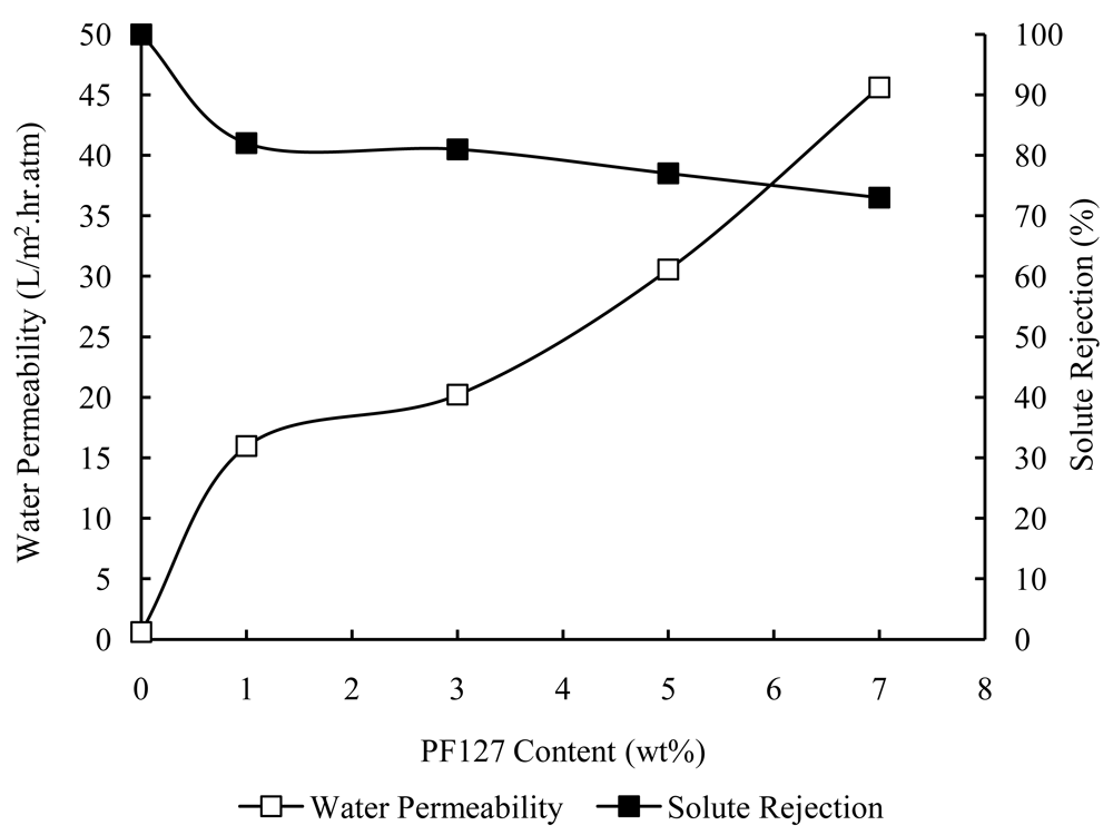 Figure 5 also shows the rejection efficiency of the dextran solution. The original PVC membrane is able to reject the dextran molecules by up to 100%. The addition of PF127 at a high concentration causes a decline in the rejection efficiency. The solution sample for the rejection experiment was prepared by dissolving a low molecular weight of dextran (i.e., 10.000 Da). This may be the reason for the reduction of rejection efficiency at high concentration of additive in this work. To achieve the best performance for permeation and selectivity, the optimization of the polymer solution could be designed by changing the relative composition of the PVC and the PF127.