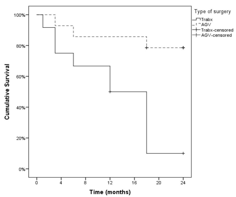 Patients in the AGV group needed fewer glaucoma medications at the final follow-up (P= 0.041). Kaplan–Meier survival curves for the two groups are shown in Figure 1. The estimated mean survival time of the surgery was 20.8 months for those in the AGV group and only 12.7 months for those in the trabeculectomy group (P= 0.002). The reason for failure of trabeculectomy was bleb fibrosis. Five patients (37.5%) in the AGV group experienced an early hypertensive phase.